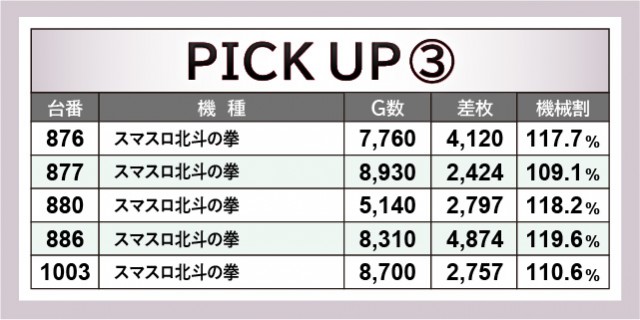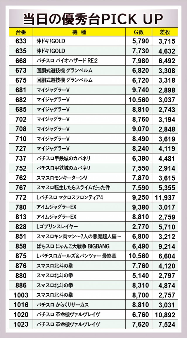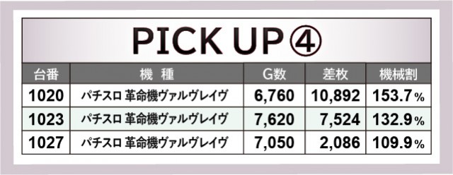 『スマスロ北斗の拳』もまた王道機種として流石の結果を残している。それ以上に熱気で上回っていたのが『パチスロ 革命機ヴァルヴレイヴ』で、1020番台+10,892枚や1023番台+7,524枚という数字を記録した。差枚数という目に見える形で盛り上がりを確認できるため、ファンは安心してレバーを叩けたのではないだろうか。
