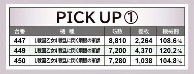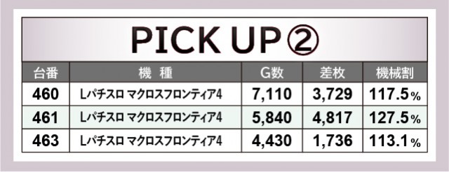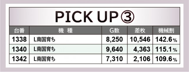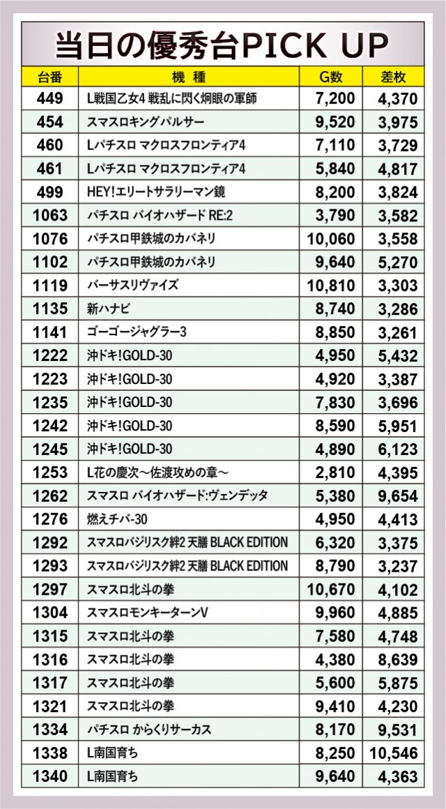 『L戦国乙女4 戦乱に閃く炯眼の軍師』449番台+4,370枚や『Lパチスロ マクロスフロンティア4』461番台+4,817枚など、大台に到達する台が多く確認できる。看板機種ばかりに注目が集まるが、これら人気機種もしっかりと活躍しているため、今後の立ち回りの指標になるだろう。そして前述したように『L南国育ち』1338番台+10,546枚という偉大な記録も生まれ、同機種のこれからの活躍も見逃せないばかりだ。