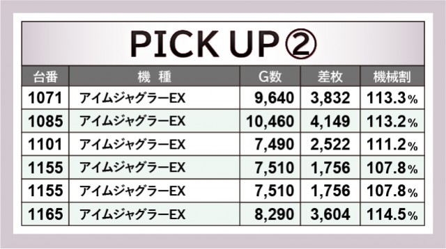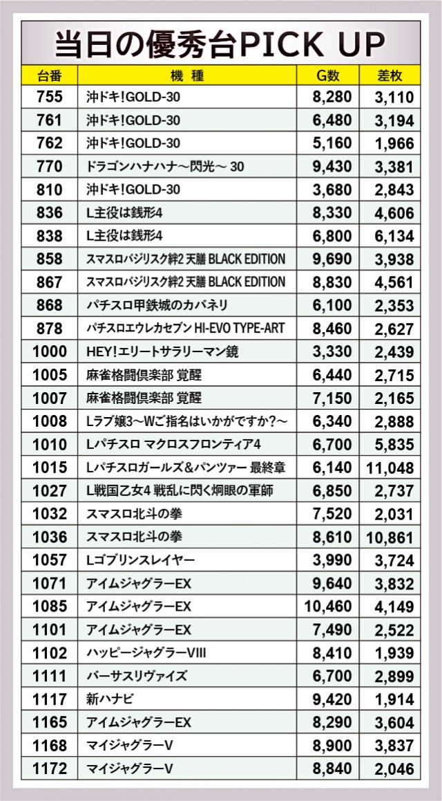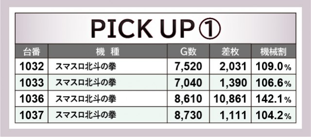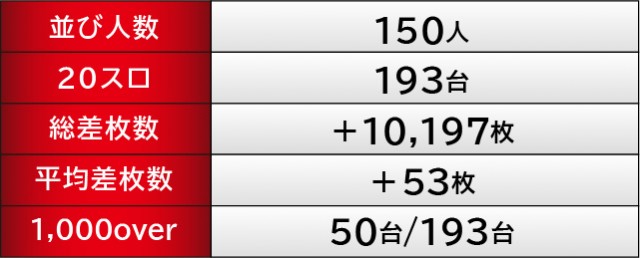 『スマスロ北斗の拳』1036番台+10,861枚という圧倒的な熱気に目を奪われつつも、終日を通して打ち込まれた台は、しっかりと結果を残しているのが分かる。また『アイムジャグラーEX』についもて同様で、1085番台+4,149枚を筆頭に右肩上がりのグラフを描いた。両機種ともファンから厚い信頼を寄せられる人気機種であるため、その役割を難なくこたなした結果と言えるだろう。