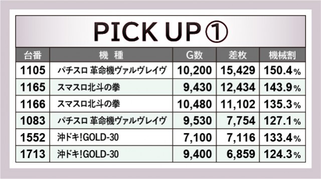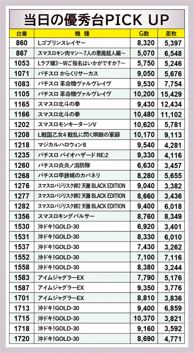 『パチスロ 革命機ヴァルヴレイヴ』1105番台+15,429枚・『スマスロ北斗の拳』1165番台+12,434枚・1166番台+11,102枚と、当日は3台の万枚OVERが発生。ほかにも7~8千枚OVERの高い熱量を確認でき、館内は大きく盛り上がっていたと言える。最多設置台数を誇る『沖ドキ!GOLD-30』も高い活気と熱気で満ち満ちており、同店の実力の高さを実感する内容と言えるだろう。