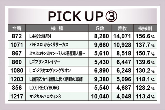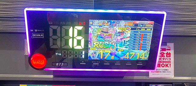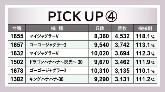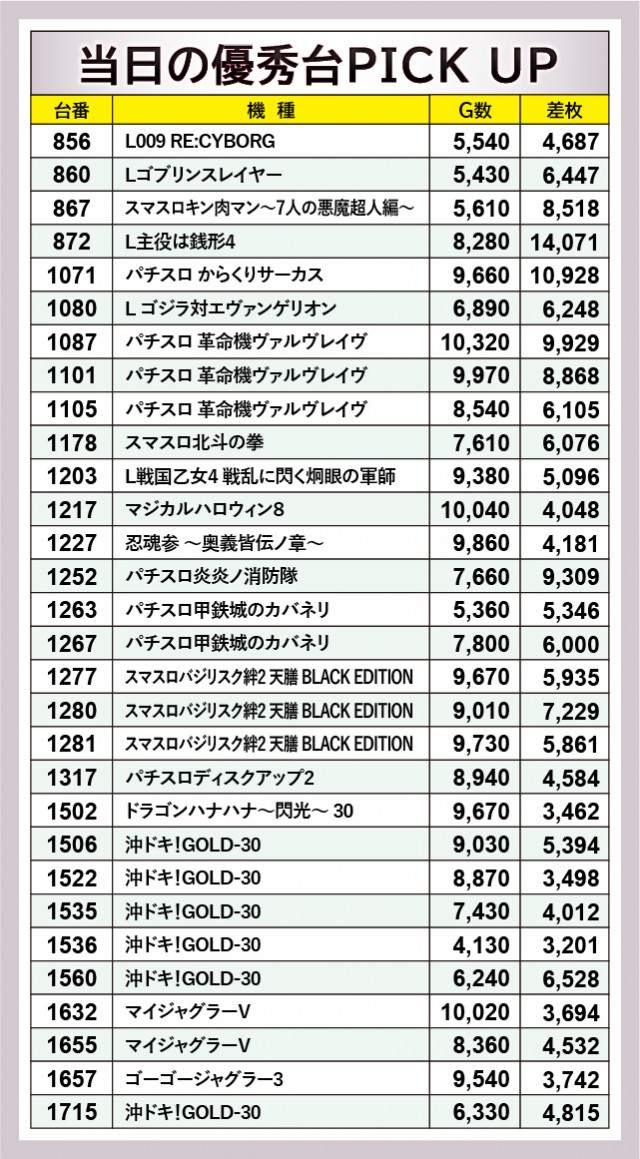 『ジャグラー』シリーズは高い回転数を記録していることから、遊技するファンが確信を持ってレバーを叩いていた様子が分かる。『マイジャグラーⅤ』1655番台+4,532枚や『ゴーゴージャグラー3』1657番台+3,742枚など、まとまった出玉を獲得しては、ファンは恍惚の表情を浮かべていたに違いない。そして『ドラゴンハナハナ~閃光~ 30』も負けじと輝きを放ち、ゲーム数と差枚数が比例する展開を披露していた。