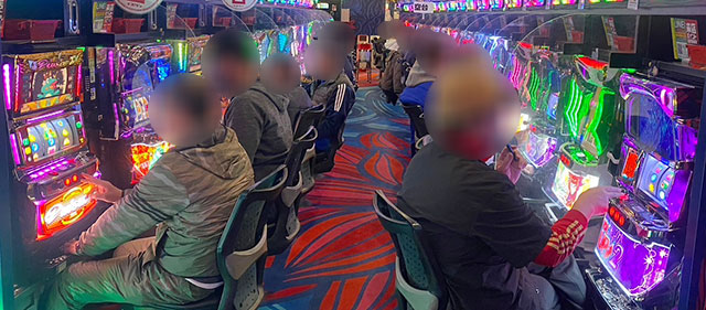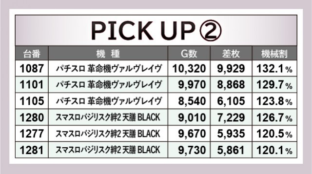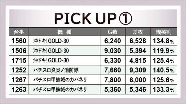 『沖ドキ!GOLD-30』は回転数と差枚数がともに大きく、ハイビスカスの輝きも相まって、ファンは有意義な時間を過ごせたことだろう。その他の機種も同様で、『パチスロ炎炎ノ消防隊』1252番台+9,309枚や『スマスロバジリスク~甲賀忍法帖~絆2 天膳 BLACK EDITION』1280番台+7,229枚、『スマスロキン肉マン~7人の悪魔超人編~』867番台+8,518枚など、各AT機から凄まじい熱が放たれていた。