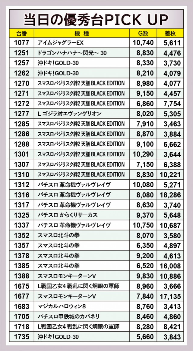 当日は凄まじい熱量が放たれ、店内は汗ばんでしまうような盛り上がりを披露していた。『パチスロ 革命機ヴァルヴレイヴ』1316番台+18,286枚や『スマスロ北斗の拳』1385番台+16,008枚、『スマスロモンキーターンV』1677番台+1,7135枚など、大量獲得に成功したファンは恍惚の表情を浮かべていたことだろう。また万回転OVERも確認でき、店内各所で高い活気に満ちており、満足度の高い1日になったのはたしかだ。