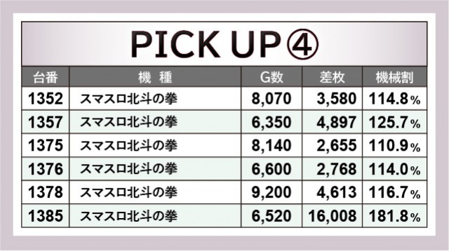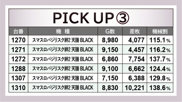 AT機群は『スマスロバジリスク~甲賀忍法帖~絆2 天膳 BLACK EDITION』『スマスロ北斗の拳』の島が高い活気と熱気を披露していた。両機種とも閉店まで打ち込まれていたのはもちろん、万枚OVERが発生していたのが鮮烈であるばかり。こちらも確信を持ってレバーを叩いていた様子が印象的で、安心して打ち込めていたのは、この上ない遊技体験になったのではないだろうか。