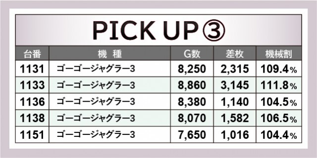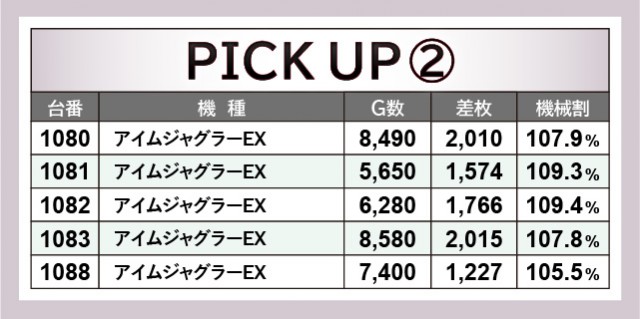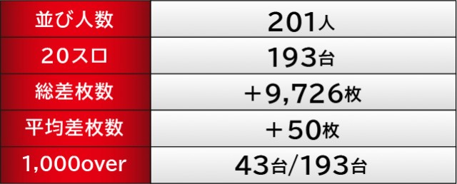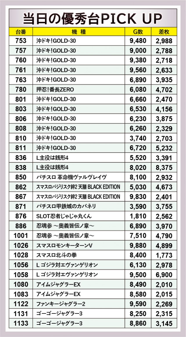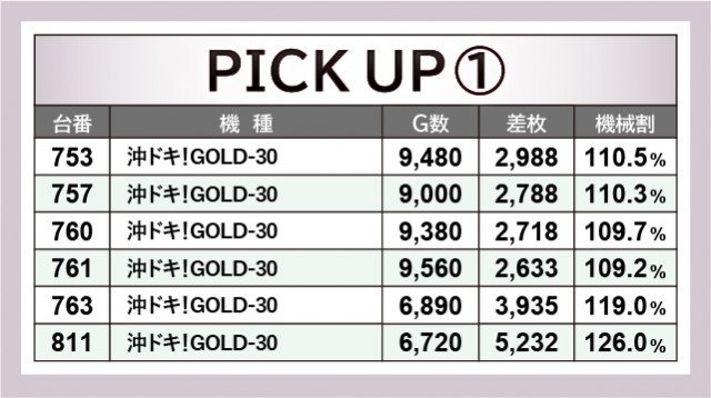 上表をチェックすると分かるように、多くの台で閉店まで打ち込まれていた様子が窺える。そのなかで『L主役は銭形4』838番台+8,375枚という回転数と差枚数が比例する展開が発生し、ほかの台も高い活気と熱気を披露していた。『沖ドキ!GOLD-30』はその最たる例で、多くのファンが自信を持ってレバーを叩き、ハイビスカスの輝きをその身体に浴びていたことだろう。