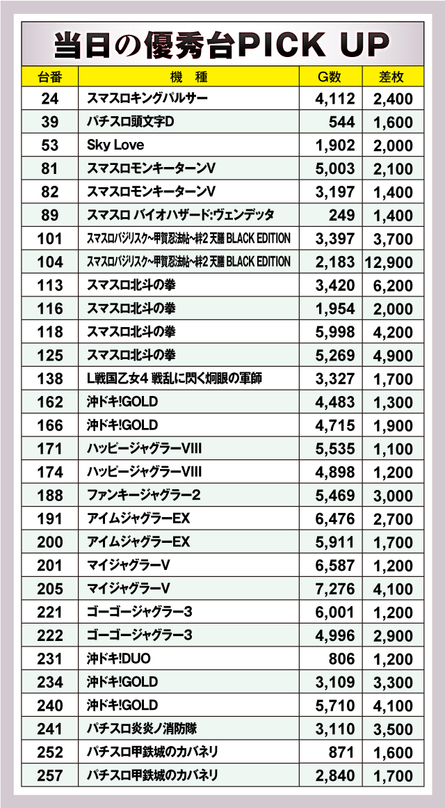 まずは優秀台30台の紹介から。30台のうち16台が+2,000枚オーバーで、+3,000枚オーバーは10台出現! それらのなかでもっとも優秀だったのは、104番台の「スマスロバジリスク~甲賀忍法帖~絆2 天膳 BLACK EDITION」で、差枚は大台突破の+12,900枚を獲得! ランクイン機種を詳しく見てみると、「スマスロ北斗の拳」などのスマスロや、30台のうち9台がランクインしたジャグラーシリーズの活躍が目立っていた!