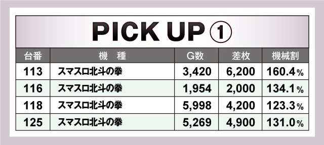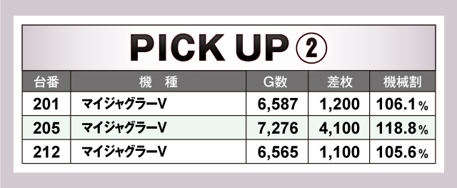 続いては、当日とくに盛り上がっていた2機種を紹介していこう。まず「スマスロ北斗の拳」は、ピックアップ4台の平均差枚は+4,325枚と当日トップクラスの好成績をマーク! 続いて「マイジャグラーⅤ」は、205番台の+4,100枚をはじめとして4ケタオーバーの好記録を複数確認! こちらもピックアップ3台の平均差枚+2,133枚と素晴らしい結果を残していた!