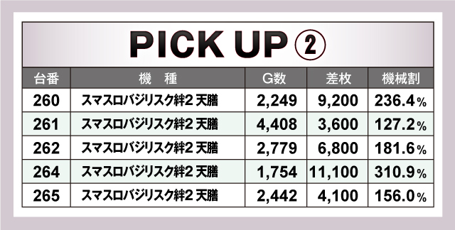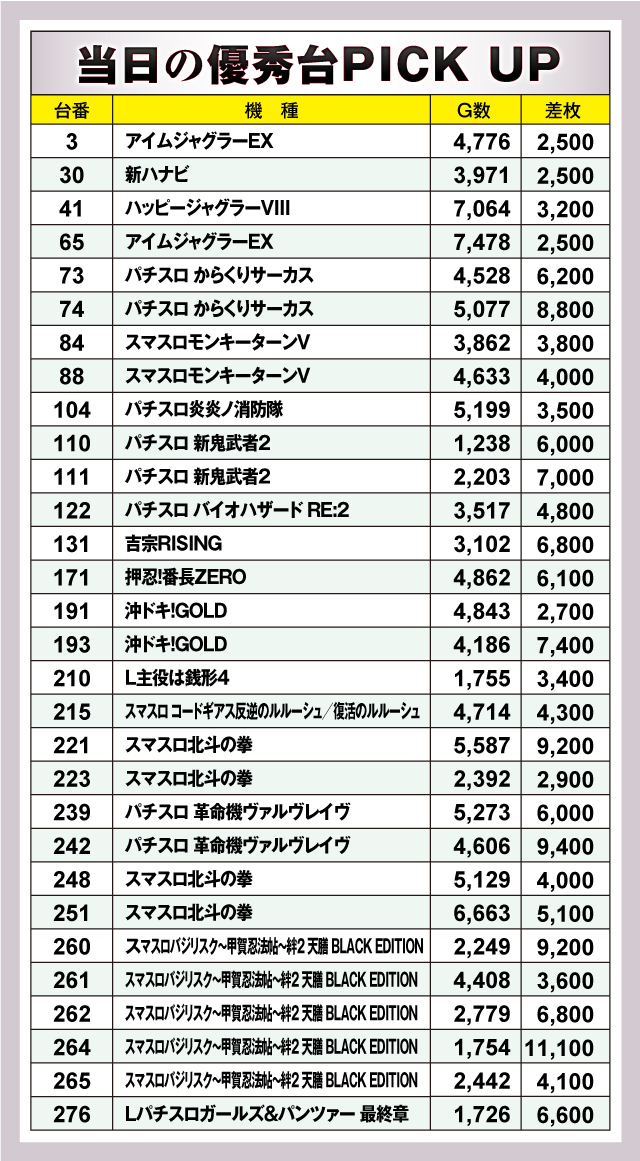 まずは優秀台30台の紹介から。30台のすべてが+2,000枚オーバーで、+5,000枚オーバーは半数の15台出現! それらのなかでもっとも優秀だったのは、264番台の「スマスロバジリスク~甲賀忍法帖~絆2 天膳 BLACK EDITION」で、大台突破の差枚+11,100枚を獲得! ランクイン機種を見てみると、スマスロが活躍するなかで「アイムジャグラーEX」などのノーマルタイプも複数台ランクイン! 多種多様な機種にチャンスが隠されていたようだ!