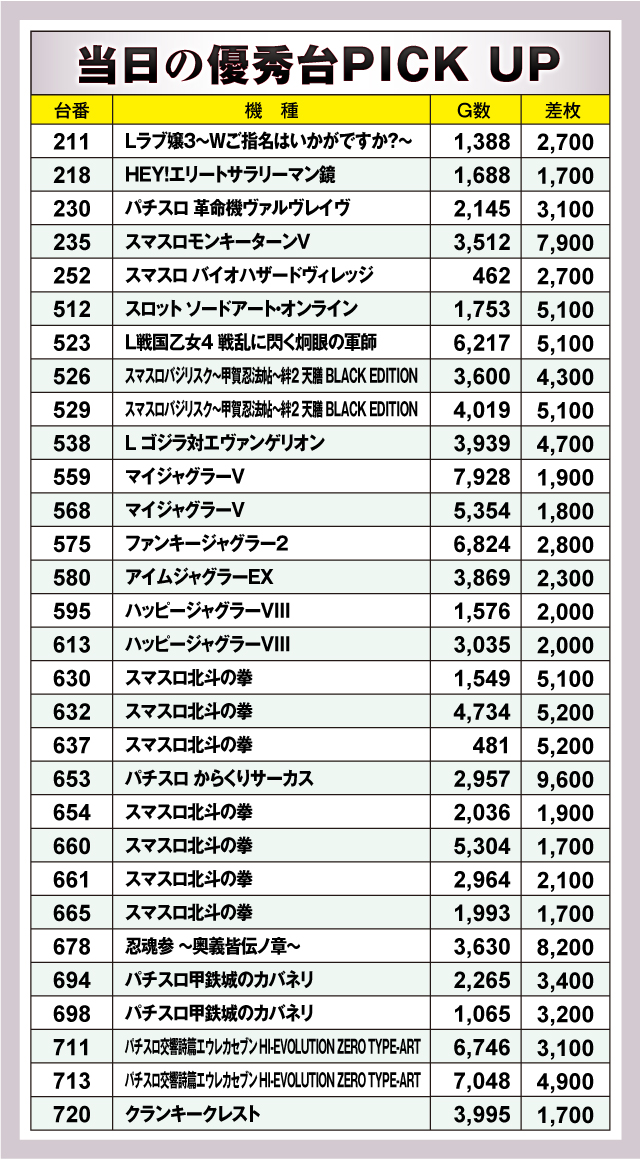 まずは優秀台30台の紹介から。30台のうち23台が+2,000枚オーバーで、+5,000枚オーバーは9台出現! それらのなかでもっとも優秀だったのは、653番台の「パチスロ からくりサーカス」で、万枚に一歩及ばずの+9,600枚をマーク! ランクイン機種を詳しく見てみると、スマスロからノーマルタイプまで多数の機種に散りばめられていたようなので、次回以降狙い台を絞る際の参考にしてもらいたい!