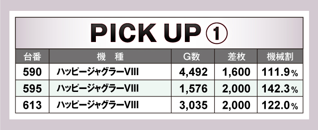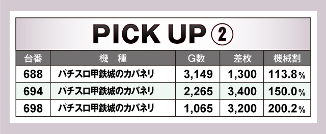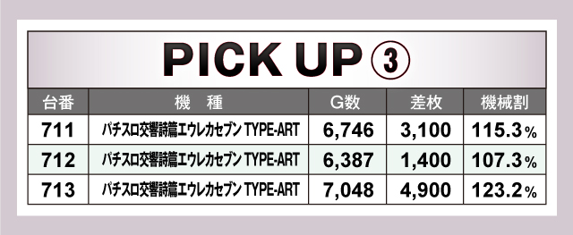 続いては、当日とくに盛り上がっていた3機種3台をピックアップ! 3機種すべてが平均+1,000枚以上のプラスで、そのうち「パチスロ甲鉄城のカバネリ」「パチスロ交響詩篇エウレカセブン HI-EVOLUTION ZERO TYPE-ART」 は平均+2,000枚オーバー! とくに「エウレカセブンTYPE-ART」は、713番台の+4,900枚を筆頭に平均+3,133枚と当日トップクラスの好結果をマークしていた! もちろんその他にも優秀台が多数確認できたので、店内をしっかりチェックして立ち回ろう!