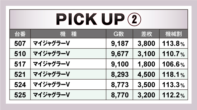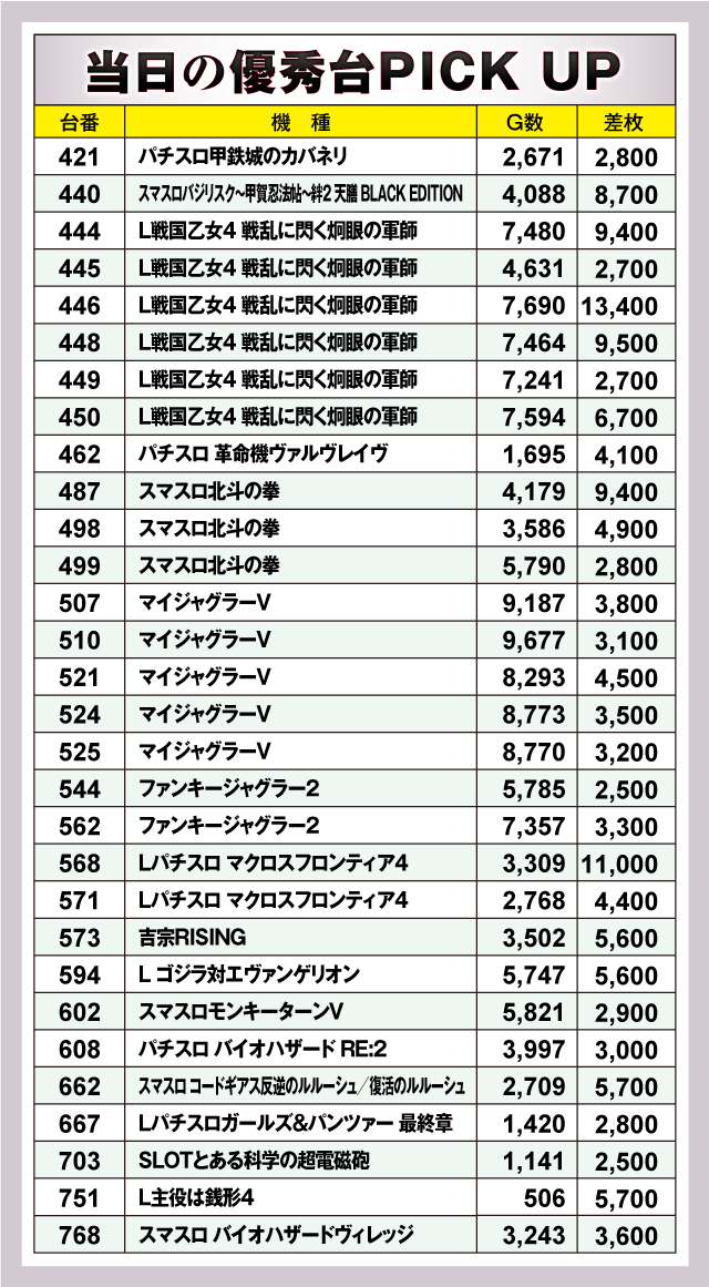 続いては、当日とくに賑わいを見せた2機種を紹介していこう。まず「L戦国乙女4 戦乱に閃く炯眼の軍師」は、優秀台の446番台を筆頭に好記録が連発で、ピックアップ6台の平均差枚はなんと驚異の+7,400枚! そして「マイジャグラーⅤ」は、ピックアップ6台すべてが4ケタオーバーのプラスで、平均差枚+3,317枚とこちらも素晴らしい結果をマーク! これら2機種が当日の盛り上がりを牽引していたことは間違いなさそうだ!