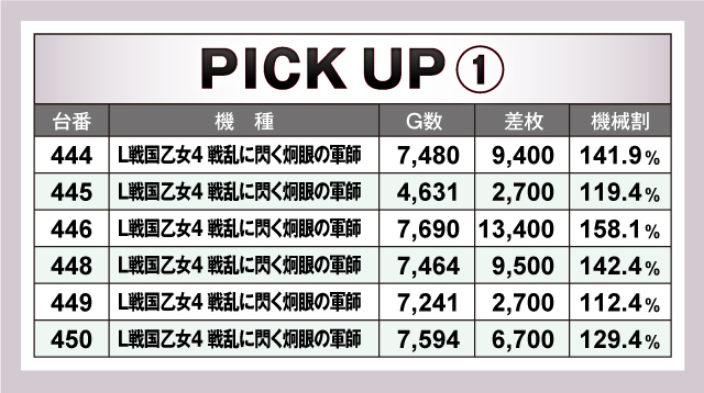 まずは優秀台30台の紹介から。30台すべてが+2,000枚オーバーで、+3,000枚オーバーは30台のうち22台出現。それらのなかでもっとも優秀な成績を収めたのが、446番台の「L戦国乙女4 戦乱に閃く炯眼の軍師」で、大台突破の差枚+13,400枚を獲得! またランクイン台を詳しく見てみると、スマスロを中心に人気機種が大賑わいで、その他ハイスペック機種に負けじとジャグラーシリーズが7台もランクインしていた!