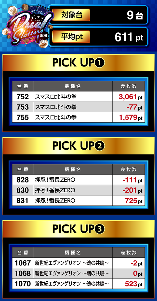 「スマスロ北斗の拳」は3台中2台が1,500ptを超え、752番台が3,061pt!