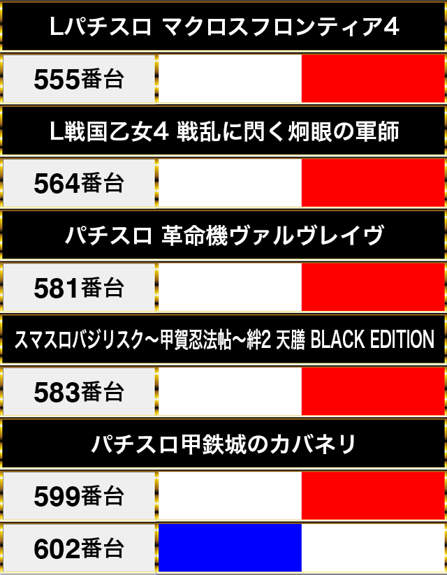 『Lパチスロ マクロスフロンティア4』の555番台や『L戦国乙女4 戦乱に閃く炯眼の軍師』の564番台もプラスptでこの日を終えた。