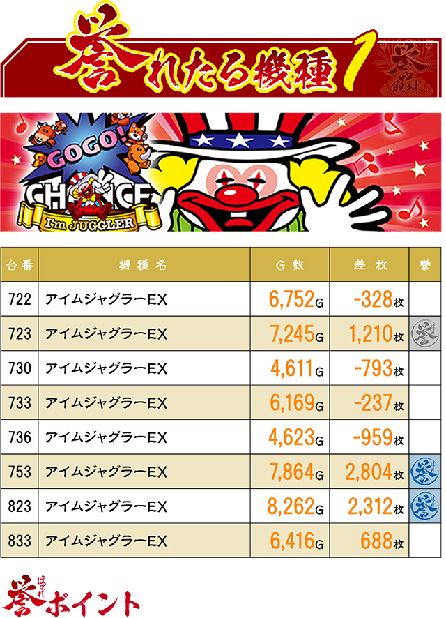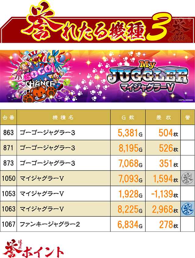 惜しくも赤誉マーキングに届かなかった『マイジャグラーⅤ』だが、優秀台としての片鱗を見せつけることには成功していたのではないだろうか。反対に『ゴーゴージャグラー3』の方は特に見せ場もなく終わってしまった。