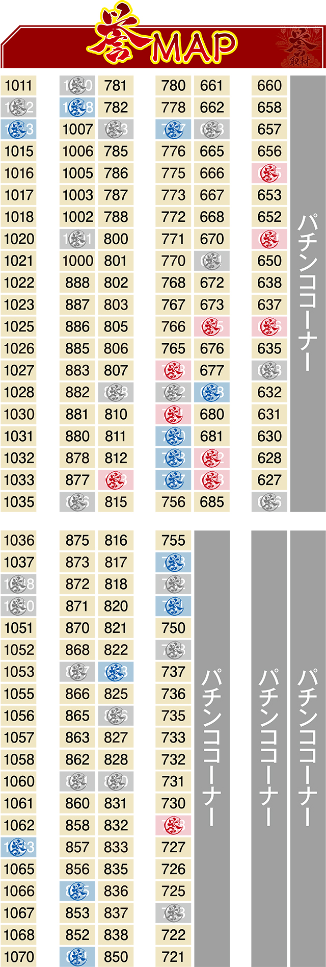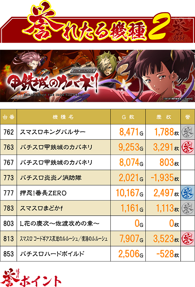 人気機種が立ち並ぶこちらのブロックでは、つい数日前に仲間入りしたばかりの『スマスロキングパルサー』に誉マーク。また『パチスロ甲鉄城のカバネリ』『スマスロ コードギアス反逆のルルーシュ/復活のルルーシュ』などの強力マシンからは赤誉マーキングも生まれていた。