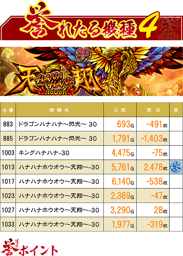 前回、誉マーキングが続出した『ハナハナ』シリーズ。しかしこの日はゲーム数不足もあってか、思うように記録を伸ばすことができず…。各台が3,000G以上回されていたら誉マークも増えていたように思うのだが…。
