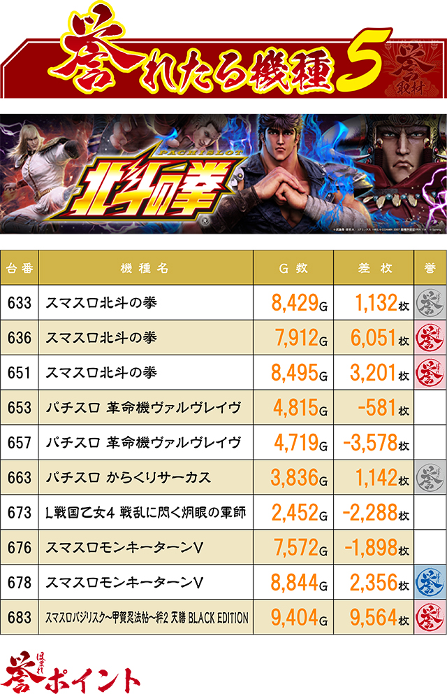 この日、最も誉マーキングが多く、かつ5,000枚オーバーを複数台確認できたのがこちらのブロック。『スマスロ北斗の拳』から3,000枚超え&6,000枚超え記録、さらに『スマスロバジリスク~甲賀忍法帖~絆2 天膳 BLACK EDITION』からは10,000枚に迫る大記録も誕生!