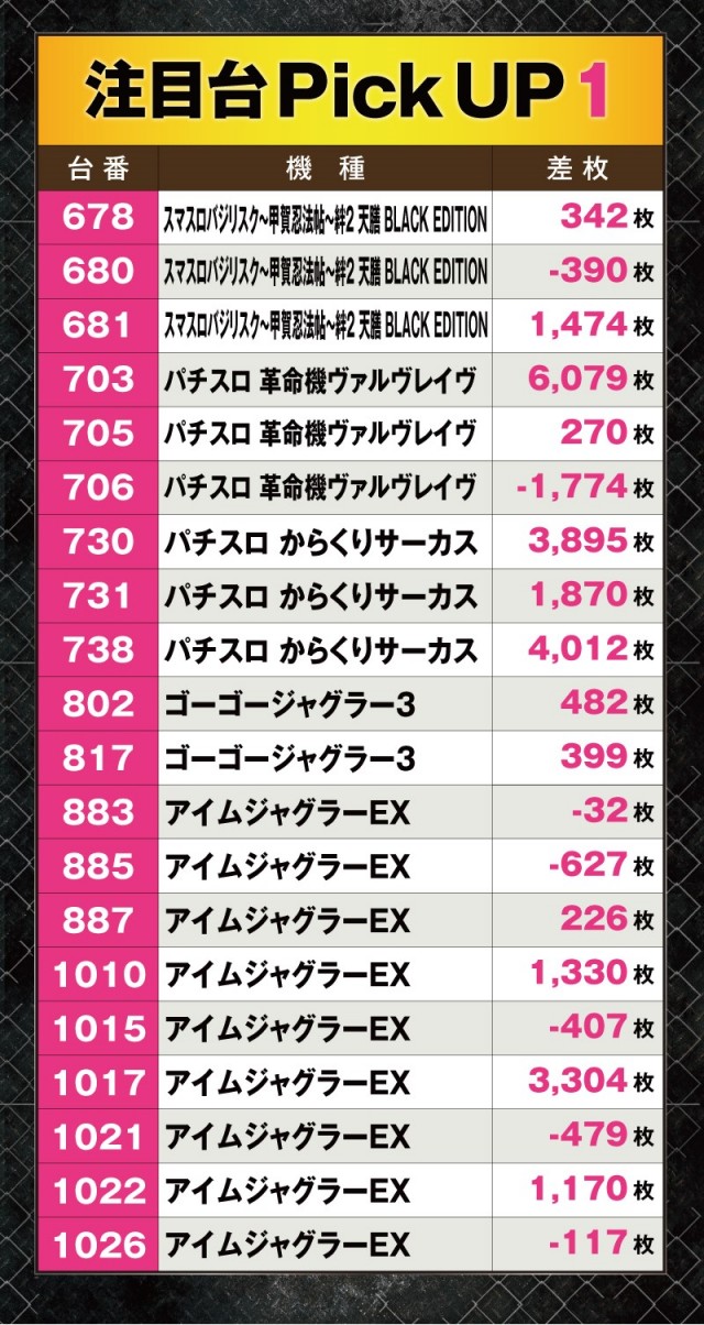 特に『パチスロ からくりサーカス』の注目度が高く、対象の3台は平均+3,259枚と華麗なパフォーマンスを披露している。