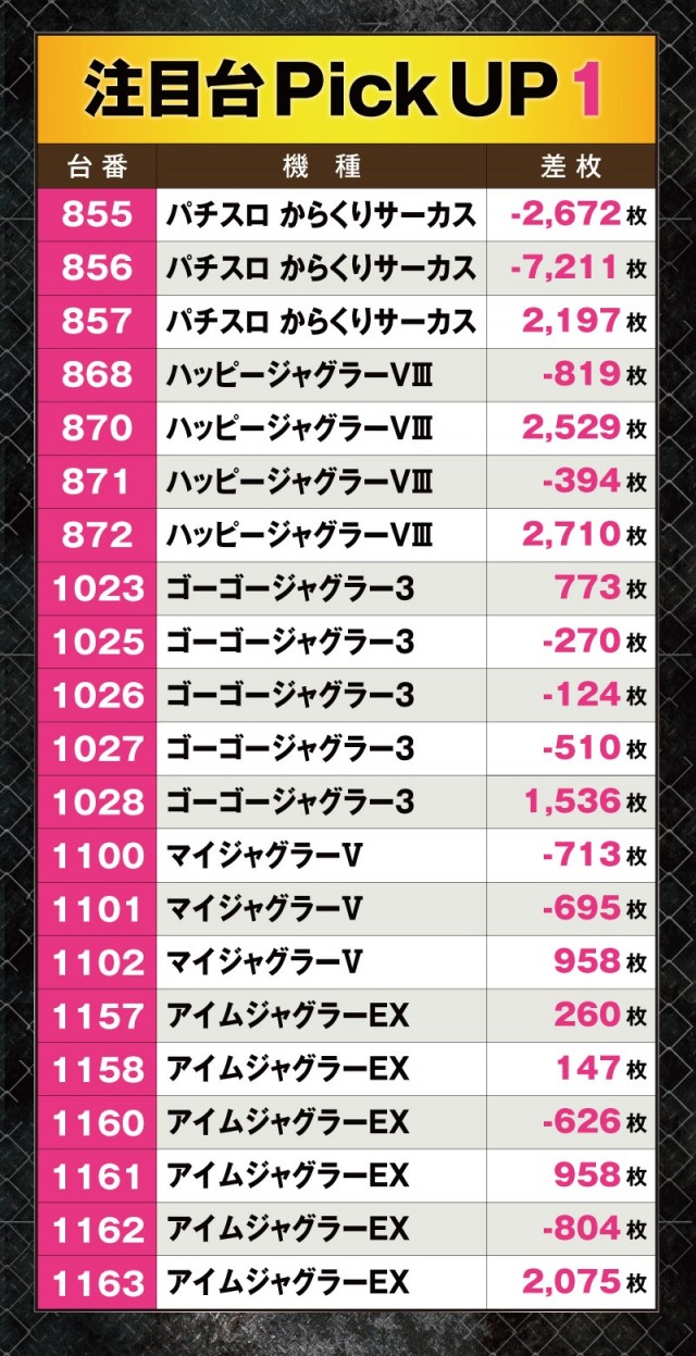 前回同様ジャグラーシリーズは並びで好調台となっており、多くのプレイヤーを楽しませていた。なかには+2,000枚を超える台も確認している。