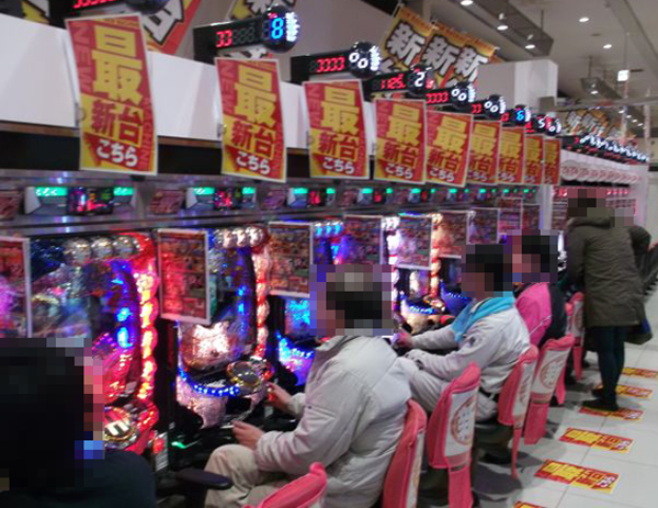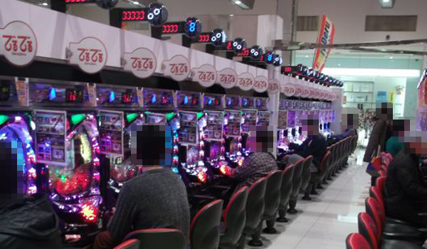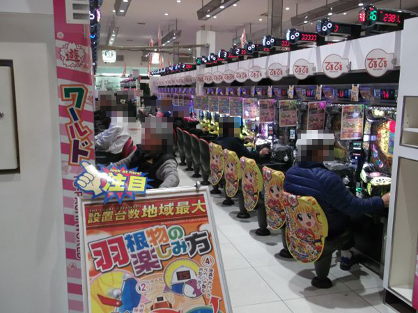 この日の4円パチンココーナーでとくに目についたのは、新台の「CR燃える闘魂アントニオ猪木〜格闘技世界一決定戦〜」と「CR真・花の慶次」の2機種。どちらも多数のプレイヤーに注目されており、「CR燃える闘魂アントニオ猪木〜格闘技世界一決定戦〜」は空き台もほとんど見られないほど盛況だった。