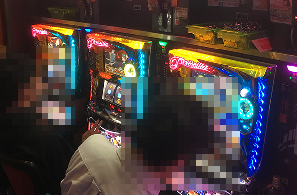 開店直後のパチスロでは、「バジリスク~甲賀忍法帖~絆」や新機種の「プリシラと魔法の本」が満席といった状況。