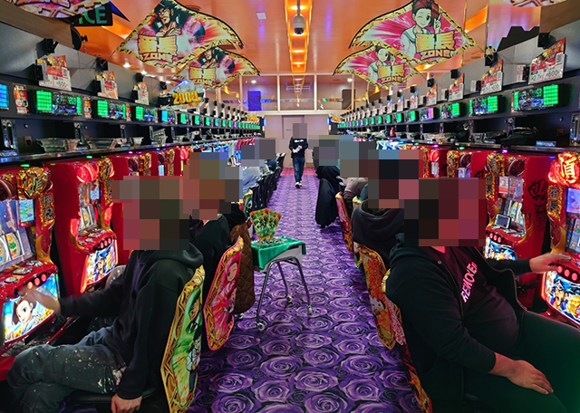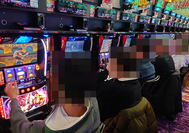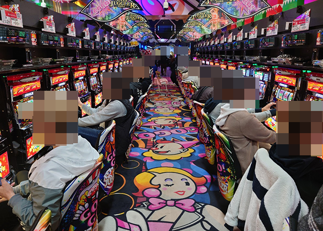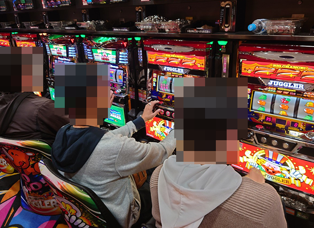 パチスロをみると、『アイムジャグラーEX』でたくさんのプレイヤーが遊技を楽しんでいた。