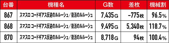 設置されている3台すべてが優秀台のニオイを醸し出していた『スマスロ コードギアス反逆のルルーシュ/復活のルルーシュ』だが、そのポテンシャルを発揮できたのは868番台のみ。5,000枚突破の勢いは止められず!