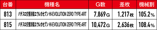 2台ともがきっちりプラっていた『パチスロ交響詩篇エウレカセブン HI-EVOLUTION ZERO TYPE-ART』。3,000枚オーバーは果たせなかったが、安定した右上がりスランプを描いていた。