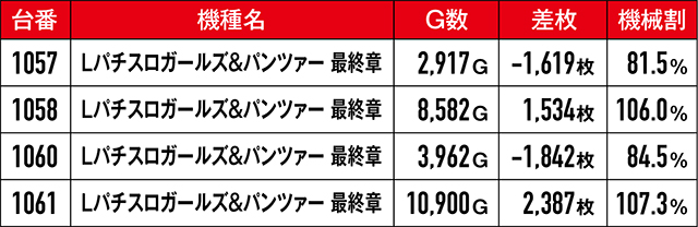 『Lパチスロガールズ&パンツァー 最終章』も全台が好調の兆しを見せていたが、2台が失速&稼働不足のためマイナスに。8,000G以上回された2台の方は実力通りの結果!
