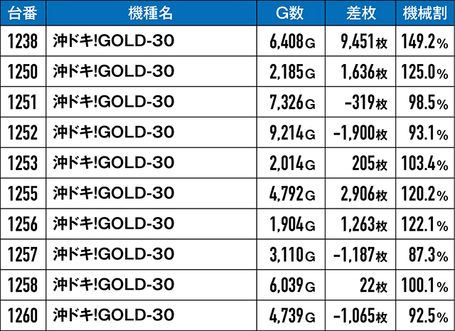 10台並びっぽい挙動を見せていたのは『沖ドキ!GOLD-30』で、こちらもゲーム数不足の台がマイナスに陥る中、1238番台が9,451枚という目の覚める結果を叩き出すことに成功!