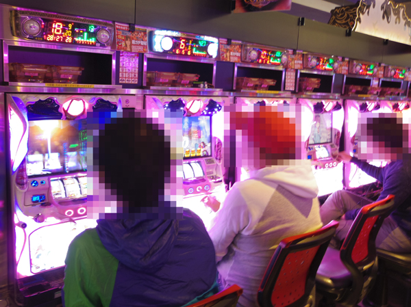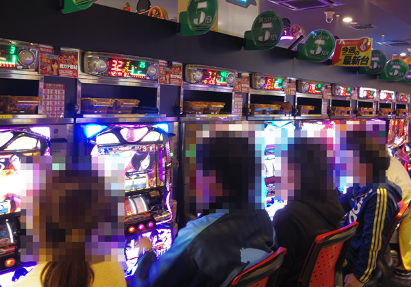 1000円/186枚スロットは幅広い年齢層のプレイヤーに人気。楽しげな表情のプレイヤーも多く、明るい雰囲気に包まれていた。