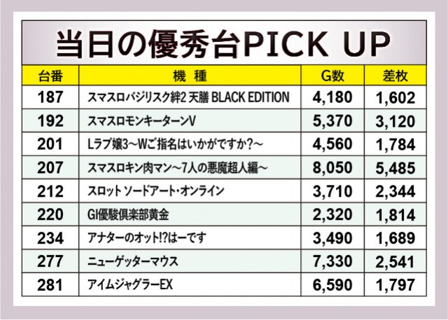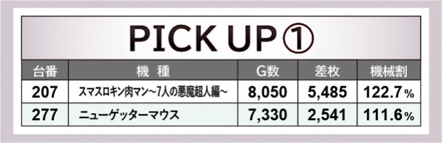 『スマスロキン肉マン~7人の悪魔超人編~』207番台が+5,485枚の熱量は前述したとおりだが、回転数も8,050Gと閉店まで遊技された形跡が見られる。また『ニューゲッターマウス』277番台7,330G+2,541枚と、こちらも回転数と差枚数が比例する展開を披露。手応えを感じていた様子が間違いなく、レバーを叩く力が強くなっていたはずだ。