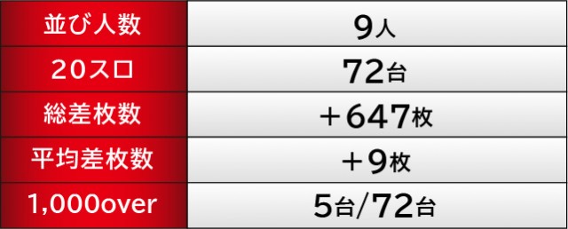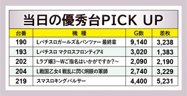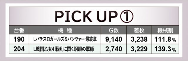 『Lパチスロガールズ&パンツァー 最終章』190番台+3,238枚・『L戦国乙女4 戦乱に閃く炯眼の軍師』204番台+3,229枚と、両機種は熱を放ち、盛り上がりに貢献した機種と言える。特に前者は朝から閉店まで打ち尽くされており、遊技していたファンが力強くレバーを叩いていた様子が容易に想像できるだろう。後者も少ないG数ながら気を吐いており、人気機種としての実力を発揮していたと言える。