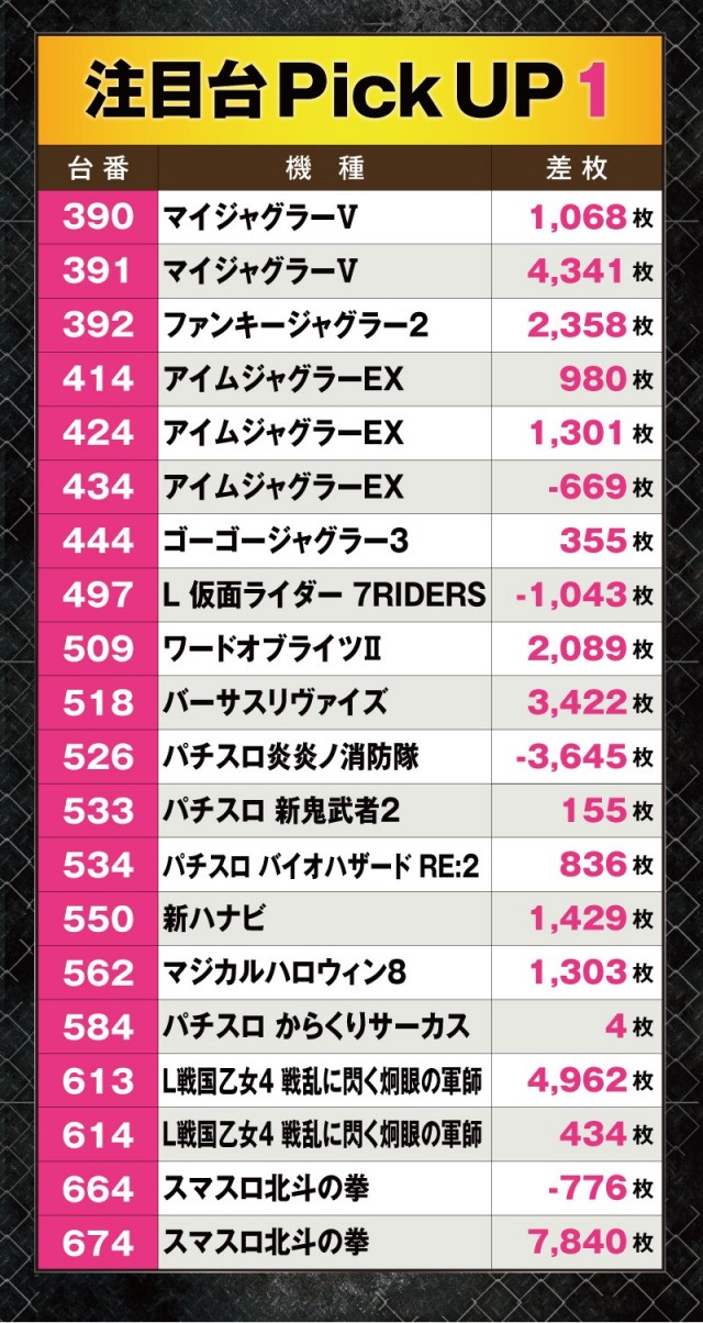 今回目立っていたのが「末尾4」。9台で平均+1,145枚と、各機種見事な活躍を披露している。