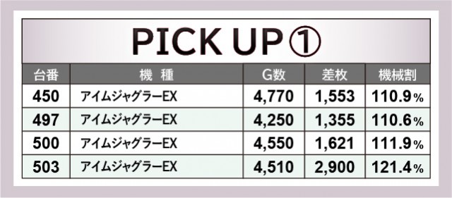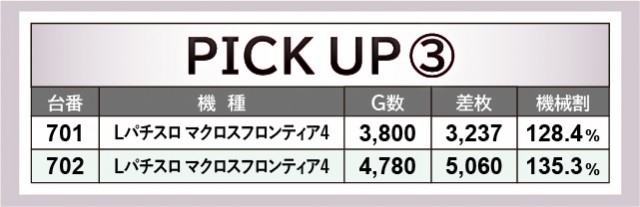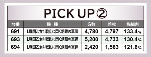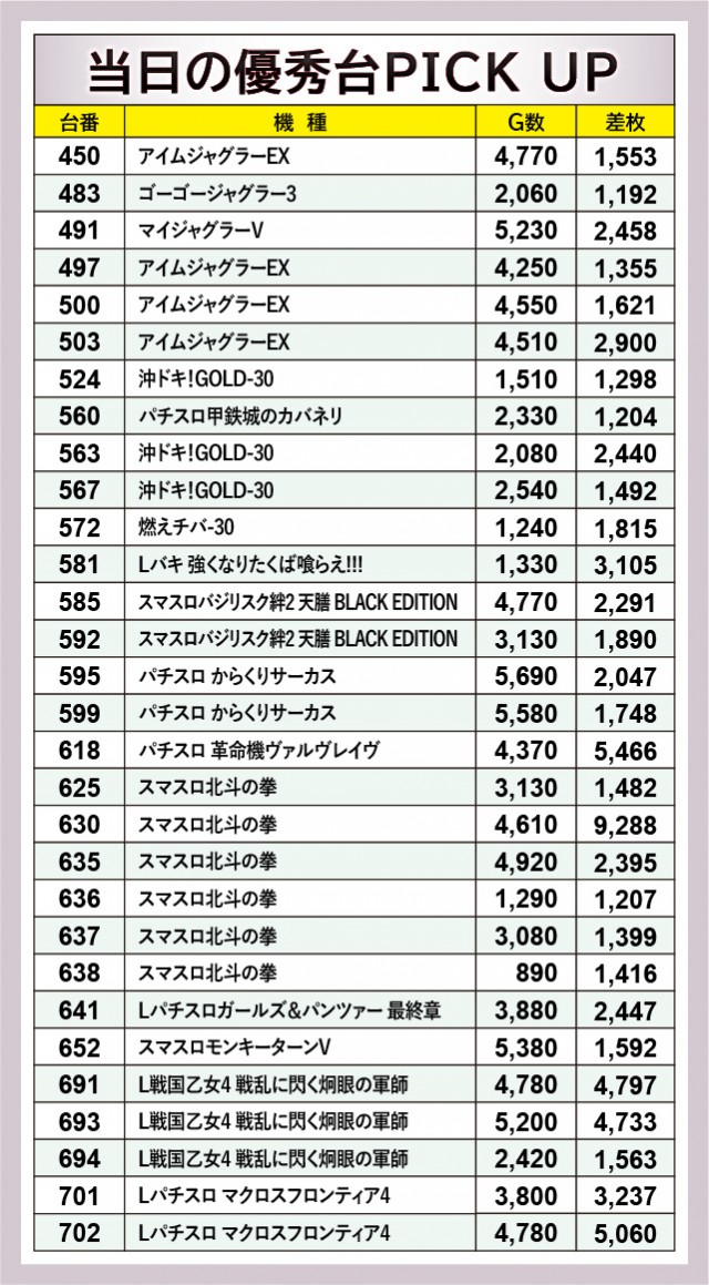 老若男女から愛される『アイムジャグラーEX』は大きな数字こそ残していないが、安定した記録が目に焼きつく。回転数と差枚数が比例する展開だったと窺うことができ、次回以降も同機種らしいパフォーマンスに期待できるだろう。そしてAT機で目立っていた『L戦国乙女4 戦乱に閃く炯眼の軍師』や『Lパチスロ マクロスフロンティア4』も同様で、安定した初当りから自信を持ってレバーを叩けていたと想像に容易い。