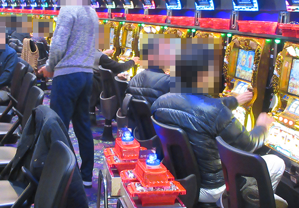 14時をまわった頃の4円パチンコでは、「CRルパン三世~Lupin The End~」が大盛況。満席となっているだけでなく、目をひくようなパフォーマンスを披露しているプレイヤーが多かったことも印象的であった。