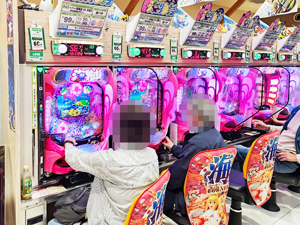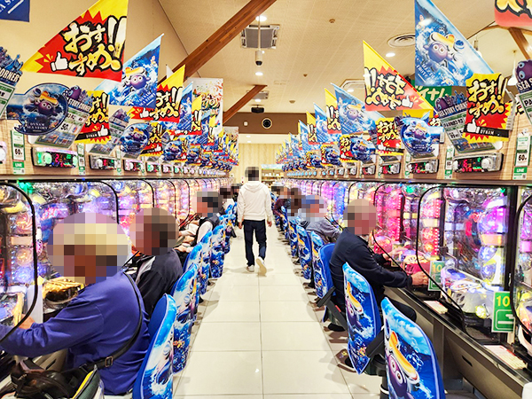 14時半ごろの1円パチンコでは海物語シリーズが好評で、プレイヤーの嬉しそうな表情を多数確認している。
