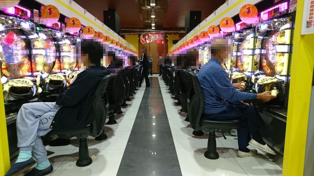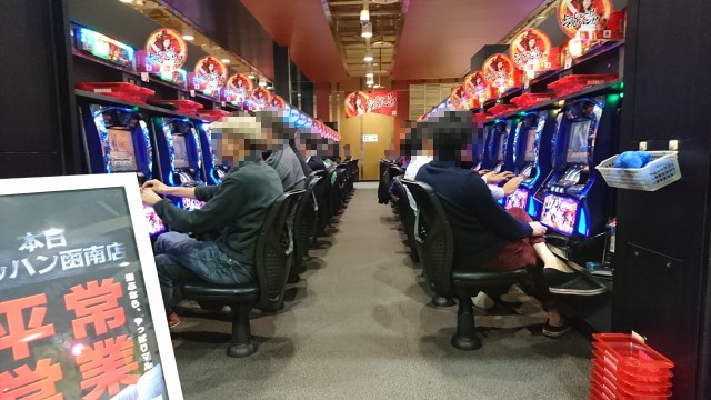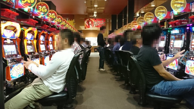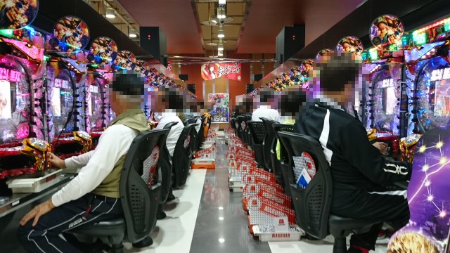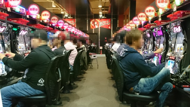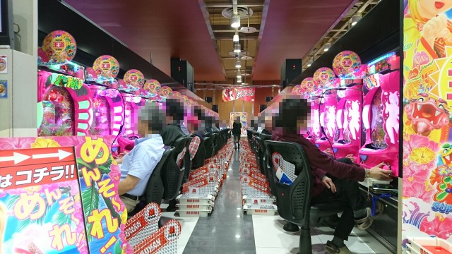 ほかにも、AT機「バジリスク~甲賀忍法帖~絆」でも満席となる人気で、多くのプレイヤーが遊技を楽しむ姿があった。青一色に染まるシマはプレイヤーたちの熱気に包まれていた。