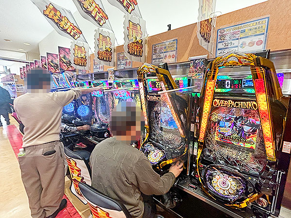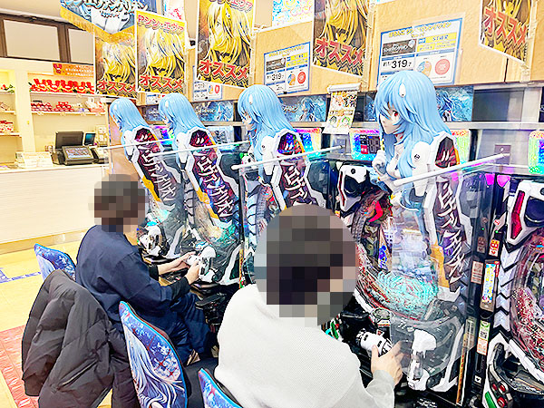 14時半ごろの4円パチンコでは、「ぱちんこ シン・エヴァンゲリオン Type レイ」や「PLT OVERLORD魔導王光臨」、「P大海物語5」から活気が感じられ、プレイヤーのイキイキとした表情が印象に残っている。