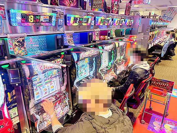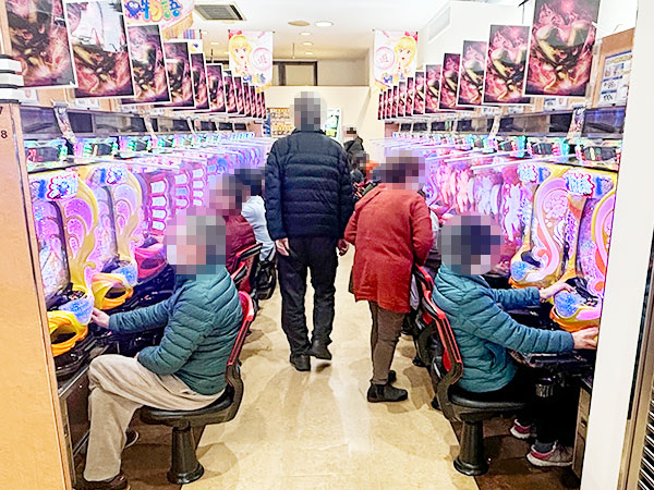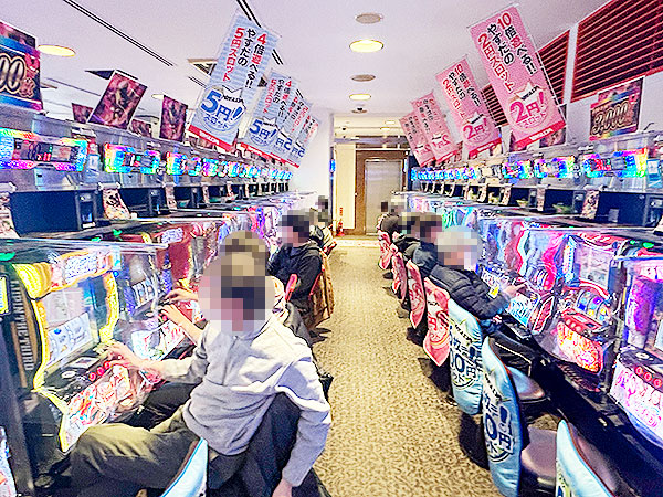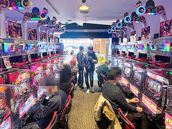取材時は既に多くのプレイヤーが集結し、パチンコ・パチスロを問わずにぎやかな状況となっていた。