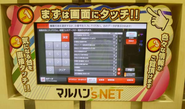 ホールの入口付近には、タッチで操作可能の特大液晶「マルハンズネット」があり、プレイヤーへの心配りが入口から感じる事ができた。