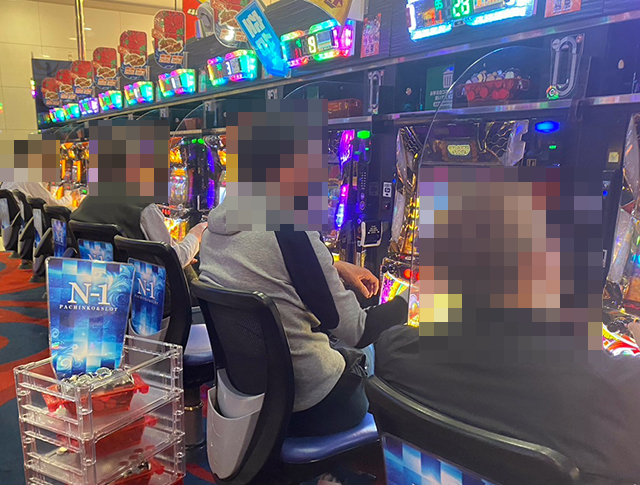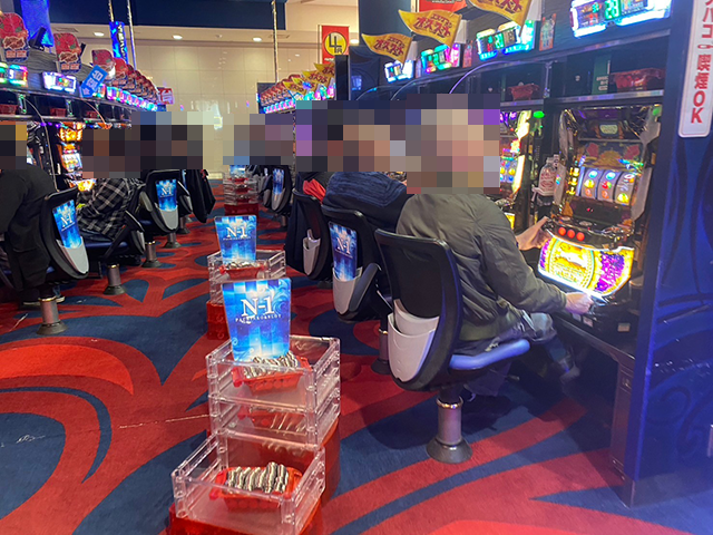 ほぼ満席となっているうえに、活気が大きく、4箱以上や3箱以上の持ち玉を確認した。