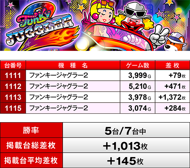 高い勝率を誇っていたのは7台設置の『ファンキージャグラー2』。大きなプラス差枚記録はなかったものの、安定してプラっていたのはニブイチ以上だったから…?