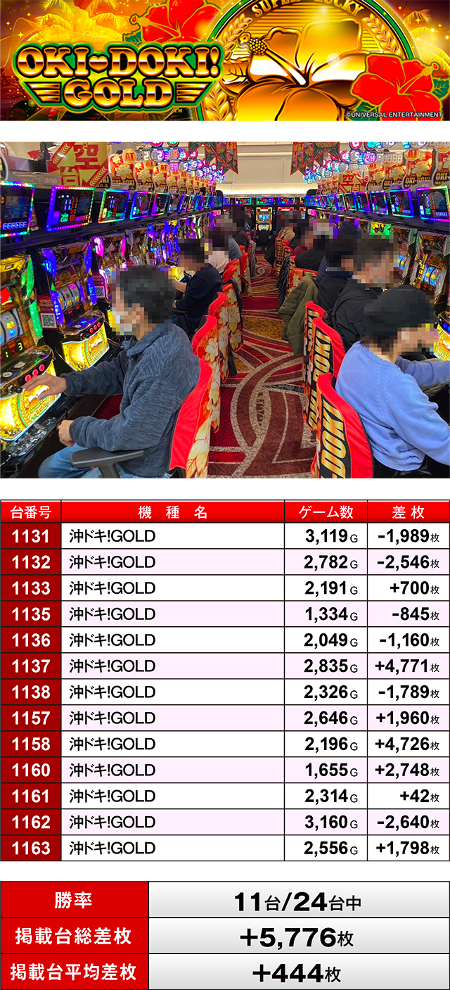 『沖ドキ!GOLD』の勝率は45.8%(11/24台)。残念ながら勝率50%を割ってしまったが、掲載台のトータル差枚はしっかりプラス値となっていたようだ。