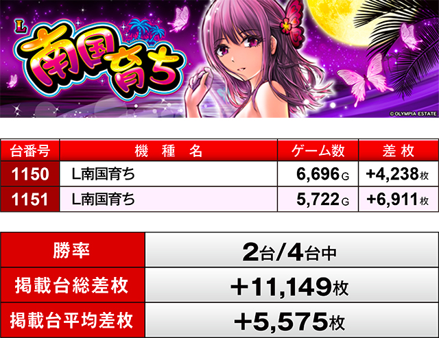 4台中2台がプラスとなった『L南国育ち』。驚くことに、プラスのその2台ともが+4,000枚オーバーを達成していたことだろう。