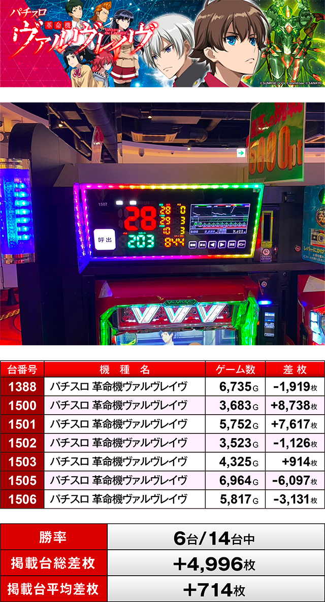 『パチスロ 革命機ヴァルヴレイヴ』も勝率5割を割ってしまったが、それを補って余りあるトンデモ記録も誕生!なんと7,000枚超えが2台も出現した!