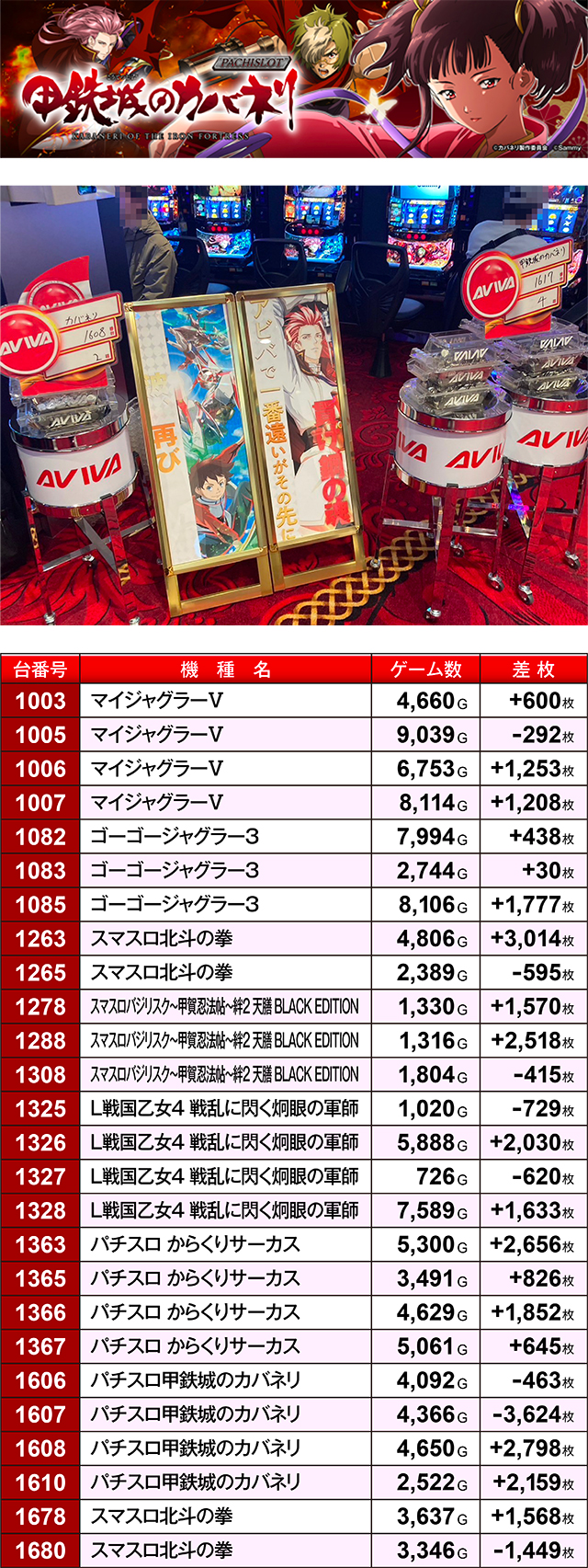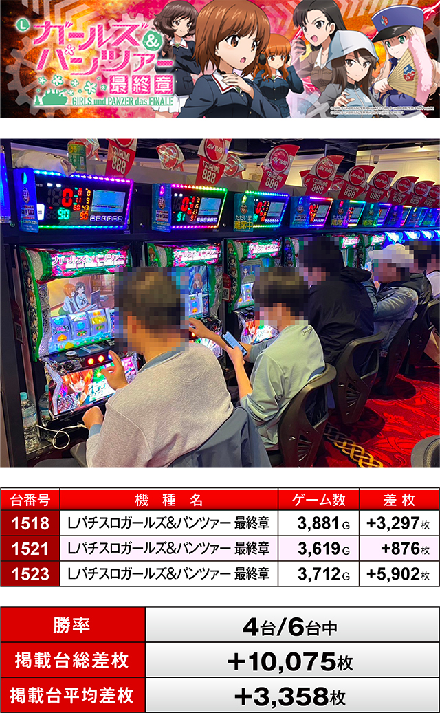 半数以上の台がプラっていた『Lパチスロガールズ&パンツァー 最終章』。上に記載している3台中2台が3,000枚を突破していることからも、ニブイチ以上の配置だった可能性が高い。
