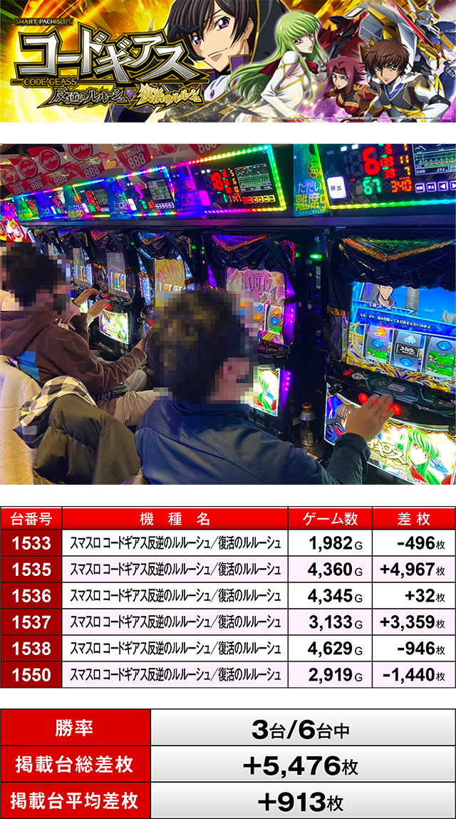 全台がプラってもおかしくない動きを見せていた『スマスロ コードギアス反逆のルルーシュ/復活のルルーシュ』だが、勝率は50%に収まった。どの台からも優秀台挙動が見て取れただけに無念…。ちなみにこの日は登場キャラ「扇要」の誕生日。それだけに全台系疑惑も…!?