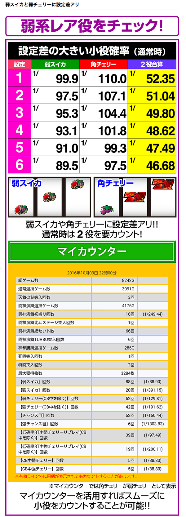 通常時にカウントしたい小役は、弱スイカと角チェリー。ひと目で小役確率が把握できるマイカウンターなどを活用し、2役の合算を設定推測の参考にしよう。